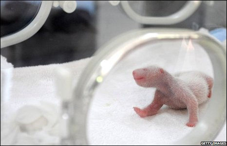 At first, I thought it must be premature or something because it looks so strange (and appears to be in an incubator). But after some google searches, I came across a really interesting blog post on newborn panda development from the World Wildlife News blog which shows some fascinating photos of a panda cub growing up.